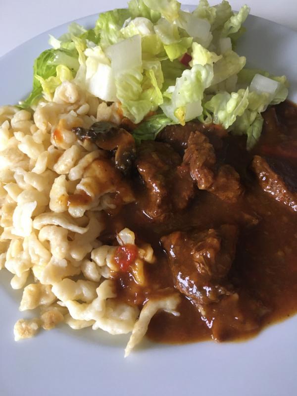 Hier auch Gulasch aus dem Tk mit Spätzle und Salat