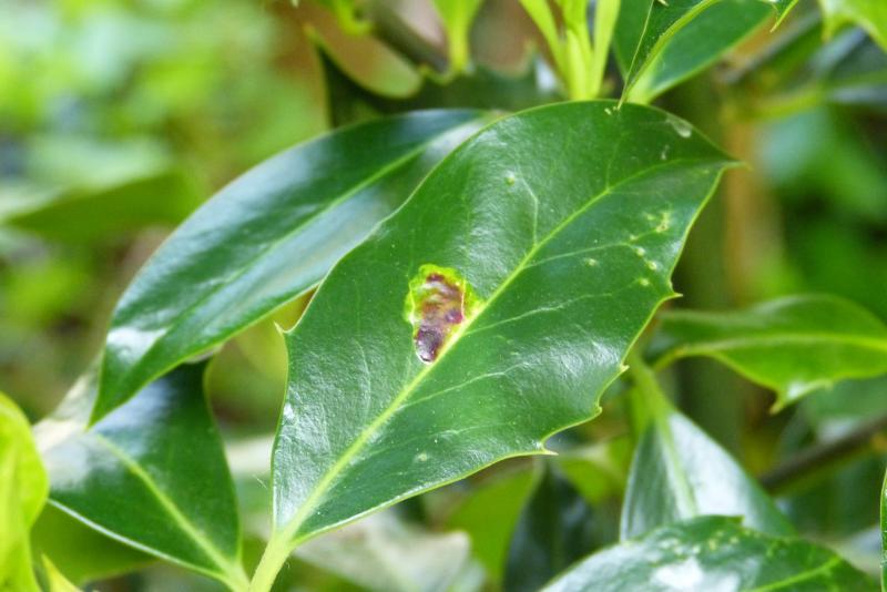 Viele Blätter weisen einen Befall mit der Ilexminierfliege auf, noch mehr (sich letztlich gelb verfärbende) Blätter haben wohl einen Pilz.
