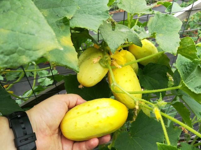 Auch in gewisser Weise Ungewöhnlich ist meine Lieblingsgurkensorte. Sie trägt den unauffälligen Namen "Weiße Minigurke" (White Miniature Cucumber) und reift über weiß nach gelb ab. Die Früchte schmecken am Besten wenn sie gerade von weiß nach gelb umfärben. Die Schale sehr dünne Schale ist dann richtig süß, genauso wie die schon angeschwollenen aber noch weichen Kerne. So was leckeres bekommt man im Supermarkt nicht zu kaufen.
