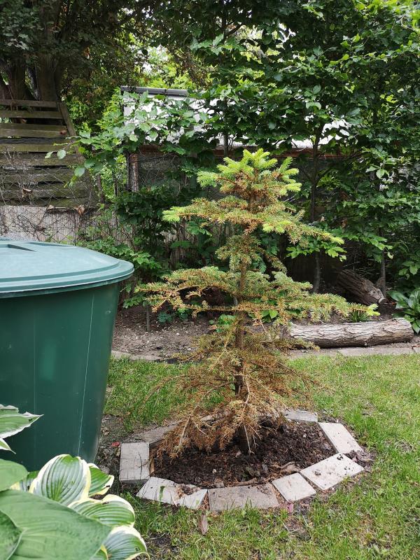 :( Der abgebildete arme Kerl war vor 3 Jahren mal unser Weihnachtsbaum. Bis vor 4 Wochen stand er im Topf, schon kränkelnd.