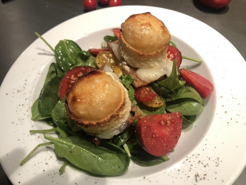 Später dann Putenkeulenbraten mit Schupfnudeln, Paprikarahm und dazu Ackersalat, Bohnensalat, Tomatensalat, Rote Bete Salat.