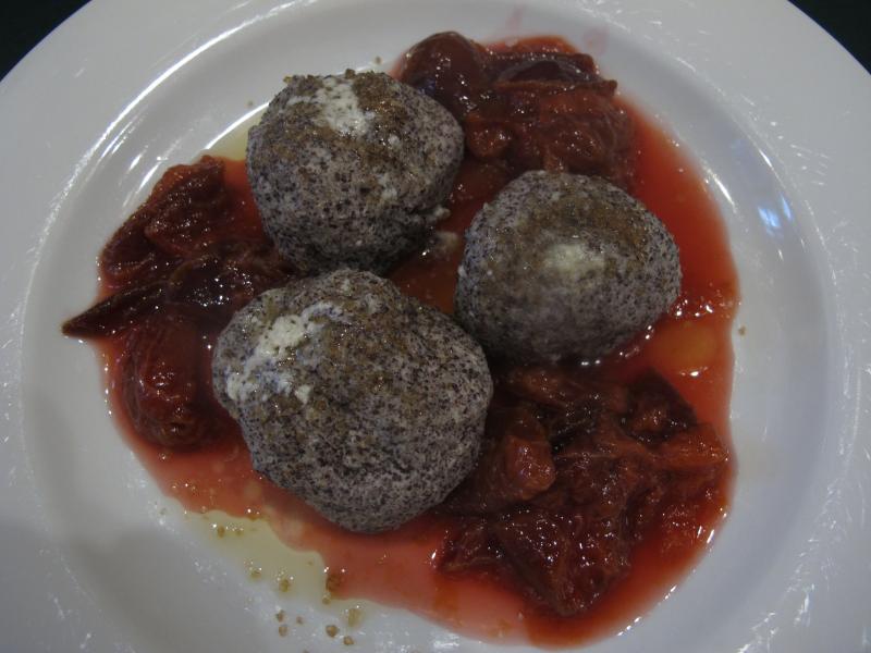 Heute dann Oktobersamstagessen nach dem Markt: Kürbistomatensuppe (Hokkaido, reife Fleischtomaten, Zwiebel, Ingwer) mit Kernöl, Topfenmohnknödl mit Zwetschkenröster: