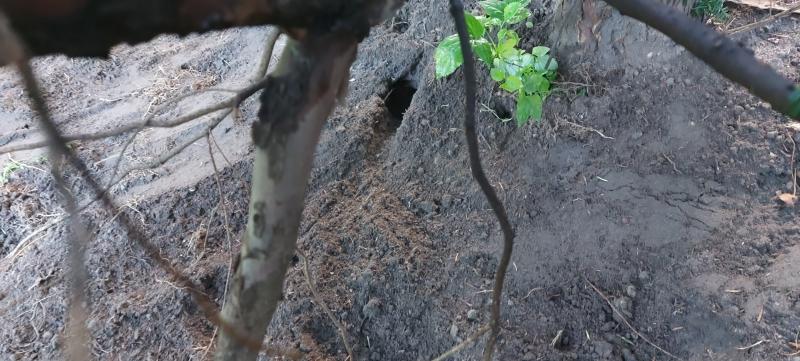 Dort steht ein großer Nadelbaum und unter ihm habe ich ein Loch entdeckt.