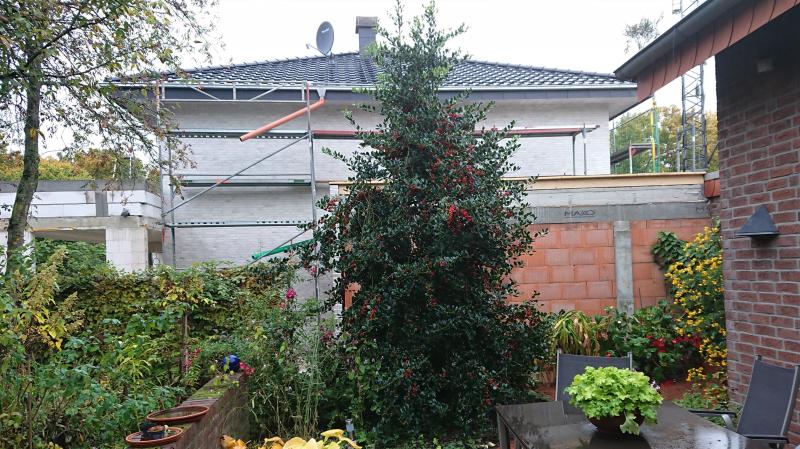 Ich habe das Glück, dass mein neuer Nachbar seinen angrenzenden Neubau bereits drei Jahre vor Baubeginn mit mir besprochen hat, so dass ich bereits einen großen Ilex als Schutz vor Einblicken aus dem großen Fenster im ersten Stock setzen konnte.