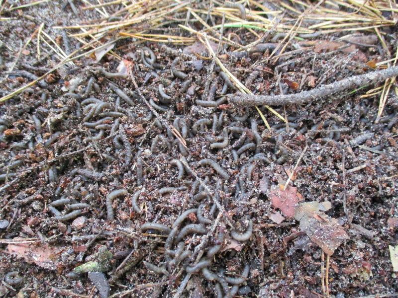 Mitte/Ende Oktober harkte ich im Waldbereich meines Gartens die dicke Schicht Kiefernnadeln zusammen. Dabei fand ich ebenfalls auf zwei Flächen von je ca DINA4 ein dichtes Wurmgewimmel. Sobald man das Gewusel berührte, erstarrten alle.