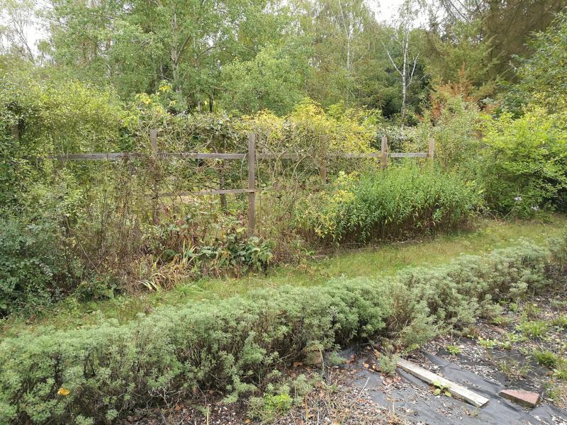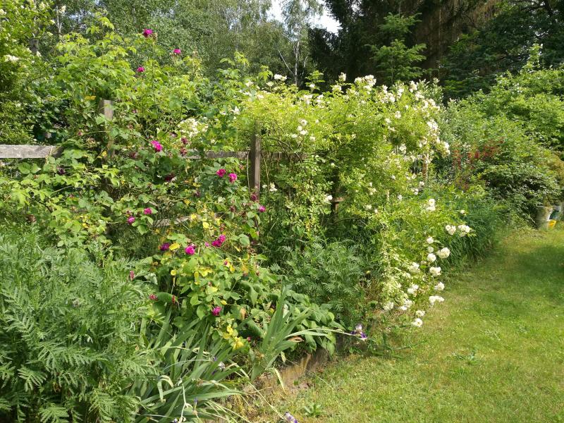 GG verhielt sich auch nicht perfekt, er hat eine Scheinzypressenhecke zu hoch und breit wachsen lassen. Die Hälfte davon habe ich später entfernen lassen, als ich noch Platz für Rosen suchte. Das Rosenspalier besteht aus einer einreihigen Pergola, dazwischen wurden Gitter montiert. An ca. 6m ist dieses Beet sehr schmal, dann wird es in einer Kurve breiter. Bepflanzt ist diese Pergola mit Kletterrosen, Clematis und Brombeeren, davor stehen noch Rosensträucher. 100% dicht ist sie aber nicht mal im Sommer, weil manche Rosen zu gerne hoch streben und unten kahl werden.