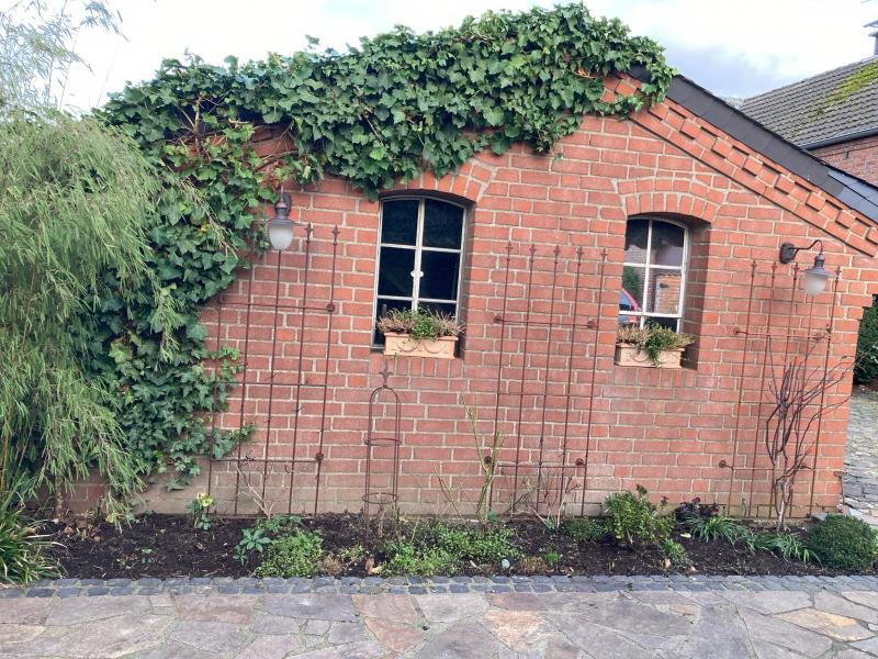 Deine beiden Clematis sind sehr dunkel vor dem Backstein, oder? Vielleicht noch eine hellere an das dritte Rankgitter? Frei lassen würde ich es nicht, und abmontieren wäre jammerschade, die Symmetrie ist so hübsch.