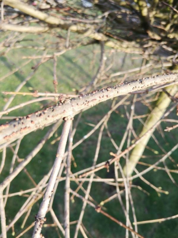 Ich habe heute an unserem Kugelahorn merkwürdige rote Flecken entdeckt und bin mir nach längerer Recherche im Internet sehr sicher, dass es die Rotpustelkrankheit ist.