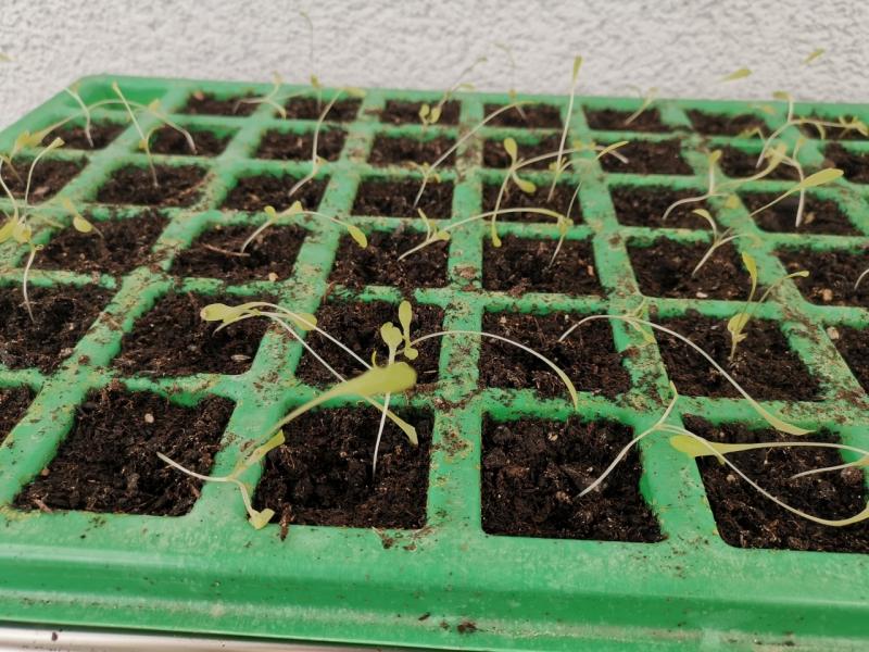 vor einer Woche habe ich den Salat pikiert, der gekeimt war (1 von 4 Sorten, MHD allerdings teilweise überschritten). Nach dem Pikieren hat er bei ca. 16°C mit 12 Std. Pflanzlicht (rot/blaue LED) gestanden.
