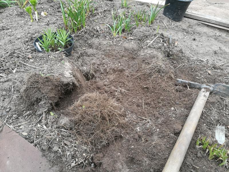 Dann habe ich die Löcher wo ich sie ausgebuddelt habe noch großer gemacht. Denn der ganze Boden war mit dem Wurzelfilz durchzogen, andere Pflanzen die eigentlich genug Abstand hatten waren vom Wurzelfilz gewürgt. Es war ein richtiges Schlachtfeld. Nun bin ich froh über die Entscheidung gegen Pseudolysimachion im gemischten Beet. Als ich fertig war entdeckte ich noch in einem ganz anderen Beet eines. Das hatte ich da geparkt. Das kommt demnächst auch raus.