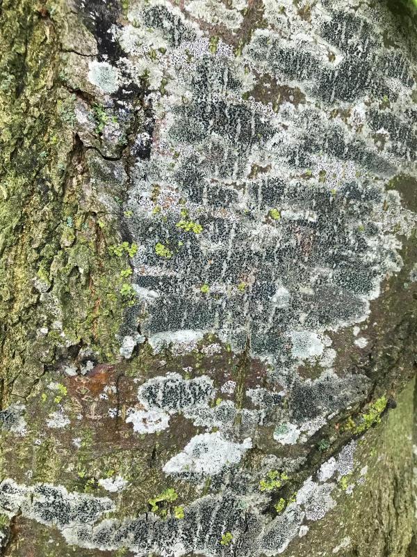 Die Flechtenthalli wachsen von Natur aus rund, werden aber durch das Dickenwachstum des Baumes in die Breite gezogen. Das bedeutet, dass die Flechte schon einige Jahre an dem Baum siedelt.