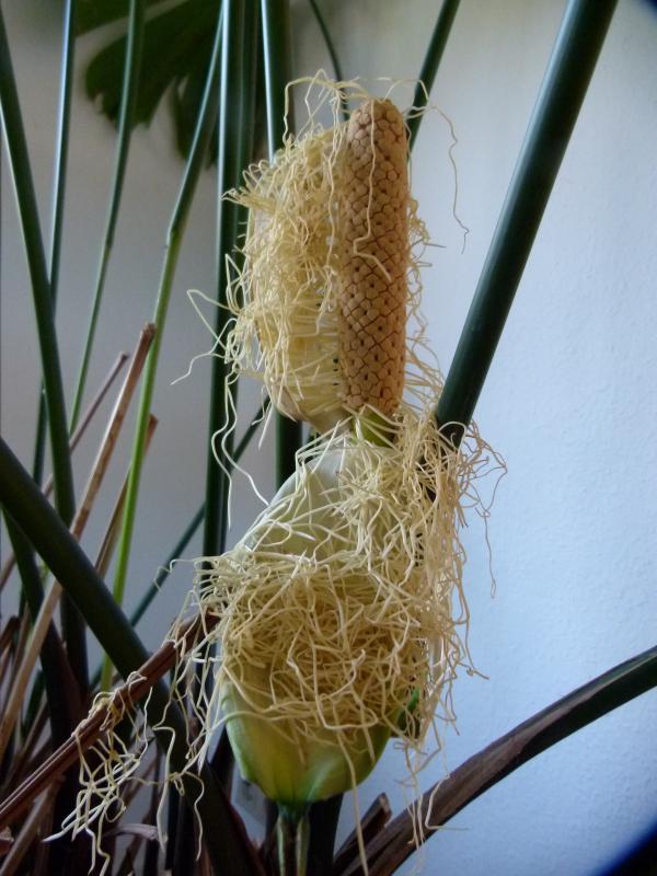 Meine alte Carludovica palmata, die ich mal ausgesät hatte, als ich 18 war, dominiert mittlerweile ein ganzes Zimmer und sie blüht auch jedes Jahr. Leider setzt sie keine keimfähigen Samen an, obwohl sich Beeren bilden. Hier die Blüte: die langen, abfallenden Fäden sind die Narben der weiblichen Blüten.
