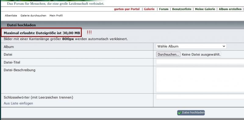 Upload-Einschränkungen: Bilder werden automatisch verkleinert, wenn eine Kantenlänge 800px überschreitet oder die Dateigröße 250kB übersteigt. 1 Bild pro Antwort möglich."