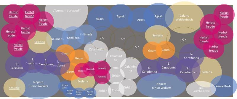 Was ich mir auch dazwischen vorstellen könnte, wäre ein Panicum das früh färbt und nicht so hoch wird. So ein Gras hält noch länger durch. Bei mir ist das'Shenandoah', das wird allerdings 1m hoch. Das neue ' Külsenmoor' bleibt bei 50 bis 80cm.