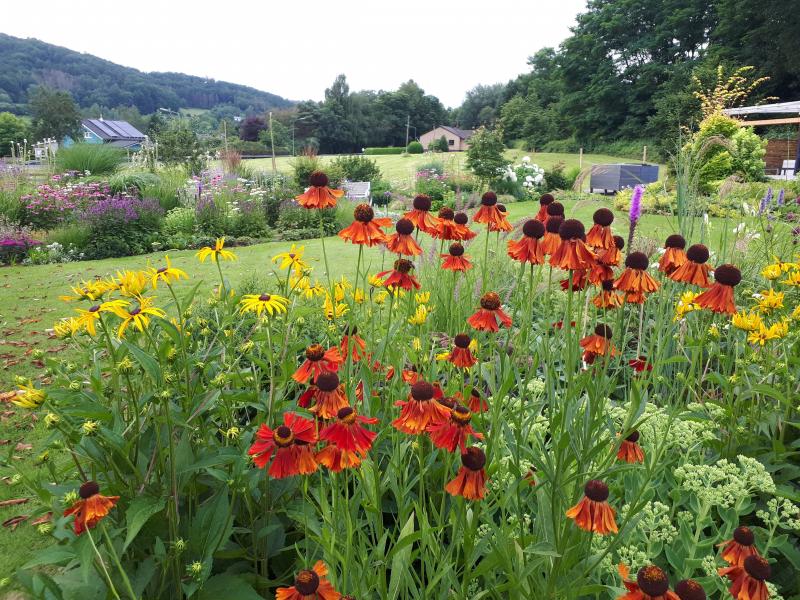 Ich kann allerdings nur Positives zu Helenium 'Moerheim Beauty' sagen. Auch wegen der irre langen Blütezeit. Dazu bleibt sie ziemlich niedrig und zierlich. Helenium 'Baudirektor Linne' geht eher in Richtung Orange, wird allerdings etwas höher und blüht deutlich später als erstere. Es gibt so tolle Sonnenbräute in Deinem Farbspektrum. Ich würde es einfach noch einmal mit den niedrigeren Sorten versuchen.