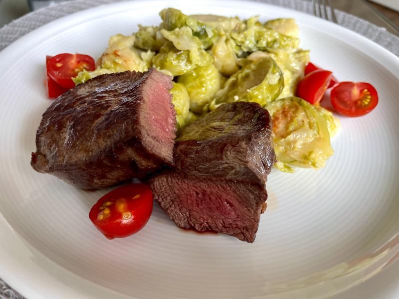 hier filet vom nordfriesischen galloway mit in sahne gestovtem rosenkohl – und für die farbe ein paar berliner gartentomaten.