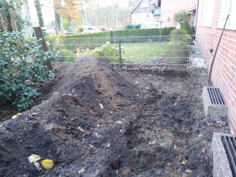 Er wird komplett umgestaltet, das heisst zunächst einmal: Alles muss raus! Ausgenommen davon sind 1.mein schöner Pinkroter Rhododendron (ca25 Jahre alt), 2.eine rote Camelie (15 Jahre alt), 3. Eine Forsythie die viel zu klein für ihr Alter ist. Dann noch ein paar grosse Thujas, jedenfalls bleiben diese vorerst.