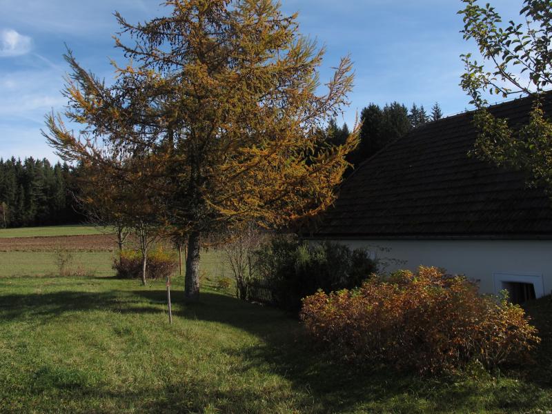 Im rauhen Klima des Waldviertels, auf fast 900 m Höhe, fühlen sich die Lärchen wohl. Wann ich meine gepflanzt habe, weiß ich nicht mehr genau, nur, daß ich sie sieben Jahre lang mit Hasengitter gegen Rehverbiß geschützt habe - es muß so Anfang der Neunziger gewesen sein, eine Freundin hatte sie mir geschenkt, weil sie wußte, daß die Lärche mein Lieblingsbaum ist. Tatsächlich ist sie viel kräftiger als die anderen Vertreterinnen ihrer Gattung in der Gegend. Ich dachte immer, Lärche ist Lärche, und meine so verzeigt, weil ihr mal jemand den Wipfel abgeschnitten hatte - ob Frevel oder gute Absicht konnte ich nicht herausfinden, ebenso den Täter 8)