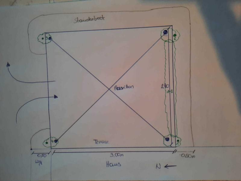 An sämtlichen der vier Füße des Pavillons soll eine Kletterpflanze hinaufwachsen, sodass der Pavillon auch richtig grün wird. Pflanze 1 wird eine Kiwibeere, Pflanze 2 eine Maracuja. Beide sollen somit auch die Südseite bewachsen und für einen grünen Sichtschutz sorgen. Pflanze 3 wird eine Campsis radicans, die als Erinnerung an die Nachbarin versetzt und hier hergepflanzt werden soll. Bei Pflanze 4 bin ich mir noch unsicher ??? Die Klettertrompete soll nämlich nicht unbedingt direkt neben dem Haus wachsen, da sie sich sonst mit ihren Haftwurzel auf der gesamten Fassaden festhält und das darf sie nicht :-P