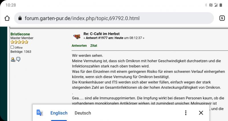 Das ist dann das Nächste, aber ich bin schon mal hocherfreut, daß mir der Borstenzapfen nicht zweimal in einem Beitrag von "sterben" geschrieben hat. ;)AndreasR hat geschrieben: ↑12. Dez 2021, 13:04... Man kann da automatische Übersetzen in den Einstellungen aber auch deaktivieren.
