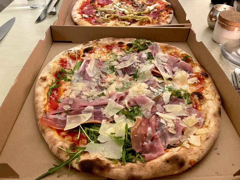 während der gartenarbeit ist der hunger größer als die kochlust geworden, so hängten sich mir auf dem heimweg zwei pizze an.
