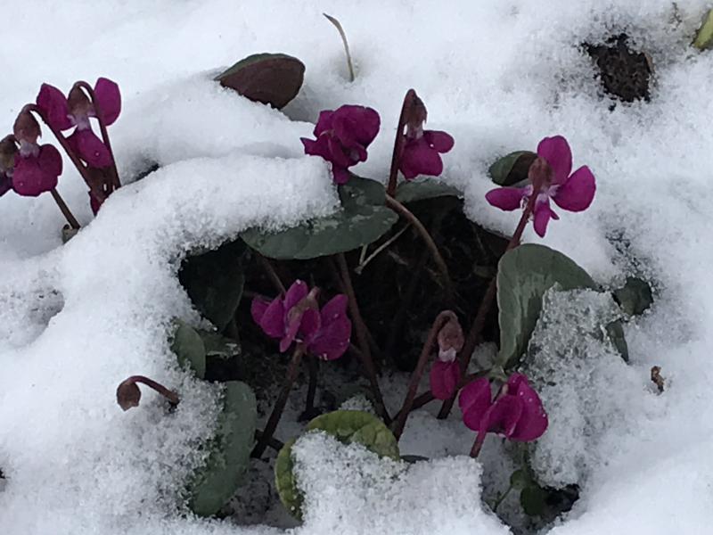 Sehr schön. Da bei uns etwas Schnee liegt kann man die hederifolium Jungpflanzen leider nicht sehen aber einige coums strecken ganz neugierig ihre Köpfchen heraus.
