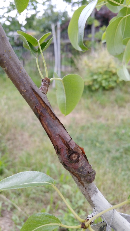 Meine vor 3 Jahren durch Kopulation aufveredelte Birne Gute Graue sieht seit diesem Jahr an der Veredelungsstelle nicht gut aus. Ist das Triebschorf? Sollte ich den Zweig ganz abschneiden? An Vitalitätseinbußen ist noch nichts festzustellen.