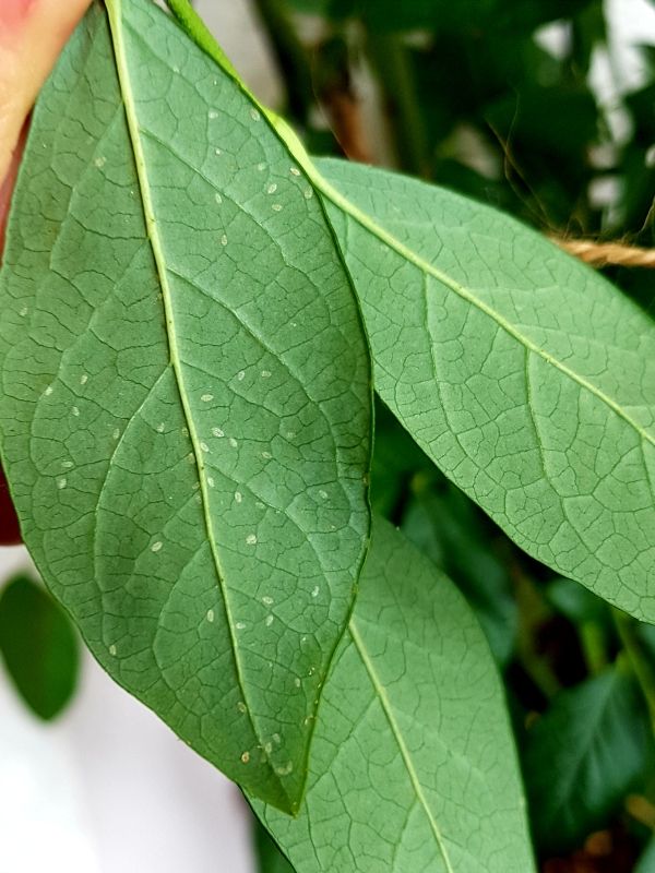 Jedenfalls erholte sich die Pflanze, auch wenn von den vielen Blüten nur wenige zu Heidelbeeren wurden, es gab keine klebrigen Blätter mehr. Ich dachte schon, ich bin sie los. Bis ich dann neulich wieder kleine Stadien auf den Blattunterseiten entdeckt habe. Müssen abertausende sein.