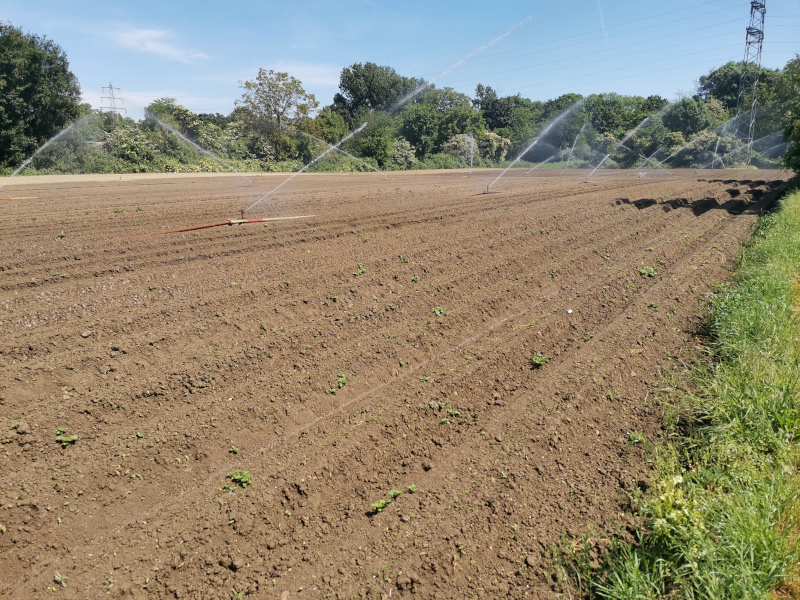 Angebaut wird 2 Reihig in Dämmen, um Staunässe und damit Fäulnis und somit Verlust der Wurzelspitze zu vermeiden. Hier die Auflaufbewässerung.