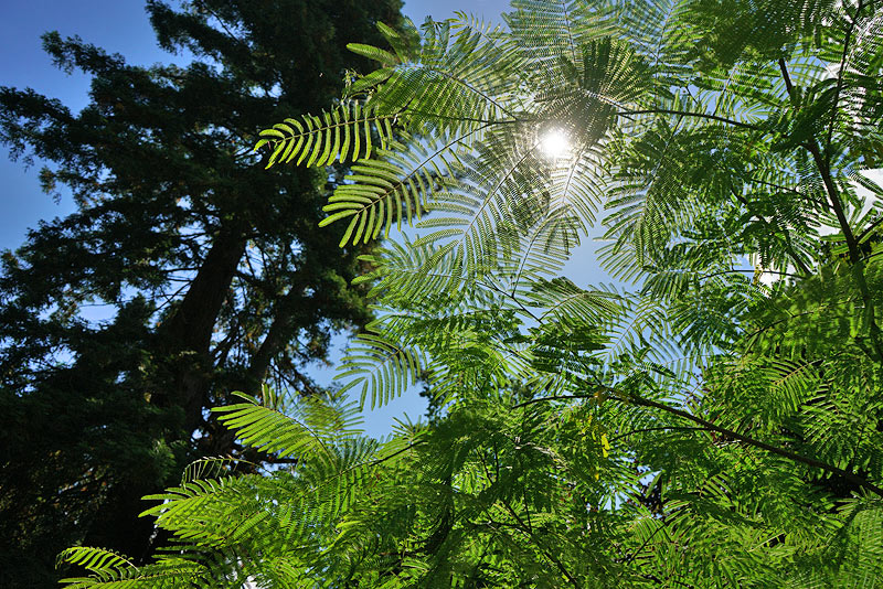 Vielleicht etwas abgehoben, aber wenns klimatisch passt: Albizia julibrissin 'Ombrella' ist hier die Verkörperung von luftigem Schatten (leider erst ab Juni).