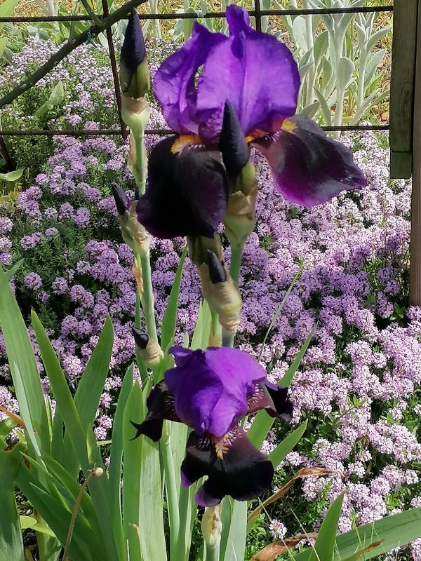 Von dieser ausgesprochen blühfreudigen hohen Bartiris kann ich nach der Blüte einige Rhizome abgeben. Ich habe sie namenlos bekommen. Sie ähnelt der Sorte 'Nightfall', ob sie es ist, ist aber unsicher. Sie blüht in herrlichen dunkelvioletten Tönen, ist unkompliziert, duftet aber nicht.