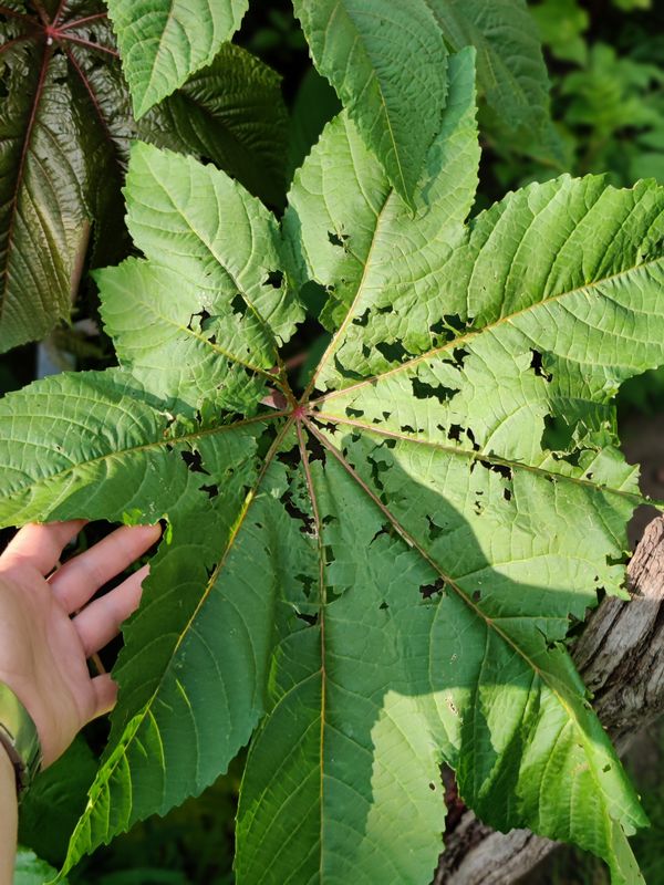 Hat jemand schonmal so ein Schadbild an Rizinus gesehen? Vorgestern waren die Blätter noch völlig intakt (habe ihn da zufällig mit auf einem Foto). Alle Blätter sind betroffen, nirgends finde ich eine Raupe oder sonstiges Getier. Auf einem Blatt fand sich aber ein kleiner Vogelschiss. Könnten unsere Spatzen sich daran ausgetobt haben?