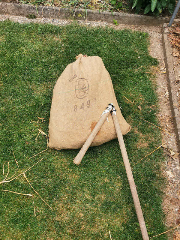 Danach muss gedroschen werden. Kaffeesack liegt rum vom Nikolaus irgendwann, Dreschflegel schnell mit Kabelbindern und etwas Schnur zusammengepfuscht.