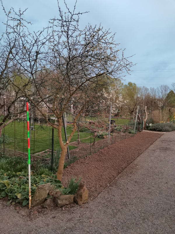 Das Beet wurde gefräst, war noch etwas feucht, aber nicht mehr wirklich zu nass. Hinterher mit dem Krail etwas glattgezogen, mit dem Spaten eine saubere Pflugkante am Rand gezogen und mit der Packerwalze drüber. So ists jetzt oben nicht zu fein, sondern ausreichend gröbere Brocken ohne Kluten. Das sollte die ersten Gewitter aushalten ohne zu verschlämmen, bis der Sandhafer dicht macht.