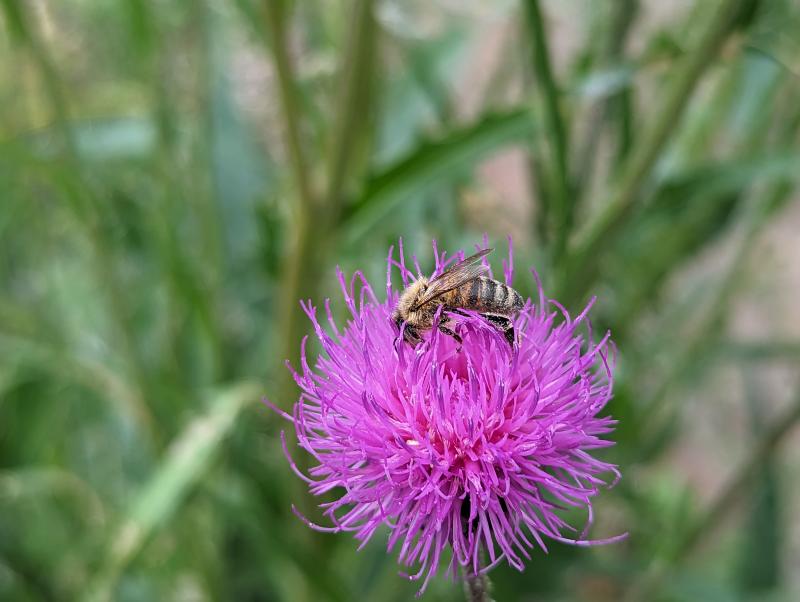 Ich habe im Garten extrem viele botanische Arten und heimische Wildpflanzen gepflanzt, vor allem, um die heimische Natur beobachten zu können. Und das funktionierte auch, ich erlebe jedes Jahr mehr an Wildbienen, Käfern, Fliegen und anderen Wildtieren, die ich teils noch nie gesehen habe. Jetzt habe ich aber ein Problem entdeckt, und zwar glaube ich, dass ich für Ertraghonig gezüchte, allein nicht überlebensfähige, in Konkurrenz zur heimischen Tierwelt stehende und allein zur wirtschaftlichen Gewinnmaximierung gehaltene, Honigbienen entdeckt habe, die bei meinem Cirsium canum die Nektartöpfe leeren und die Pollen abgrasen, während die Wildbienen aussterben. 40 Stück habe ich an der Pflanze gesehen und sie waren sehr effizient beim Klauen für den privaten Nutznießer.