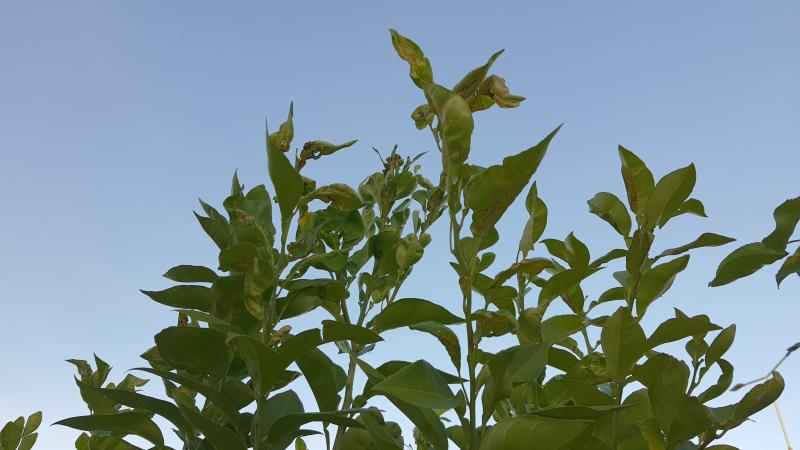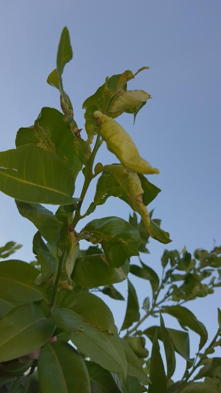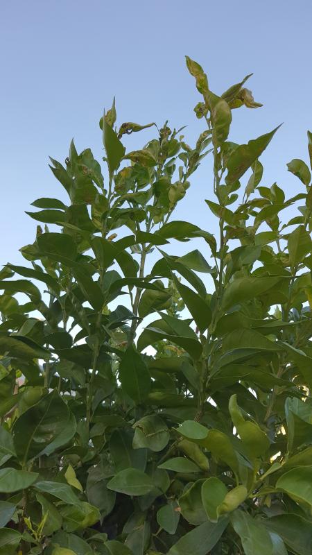 Leider haben diese Zitronenbäume alle Schäden an den Blättern - aber nur an den Triebspitzen, die anderen Blätter sind in Ordnung. Die Blätter kringeln sich und werden teilweise gelb.