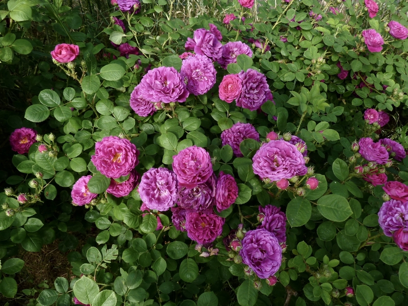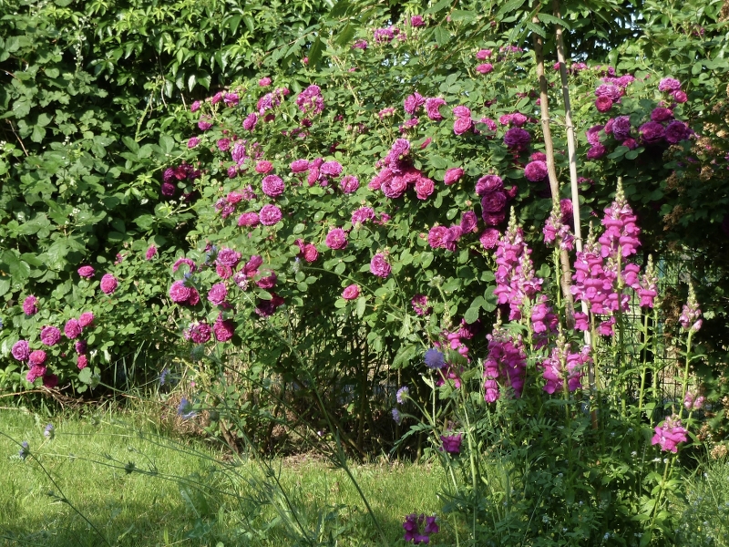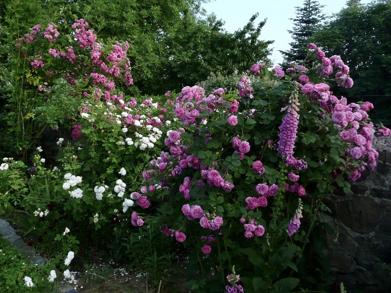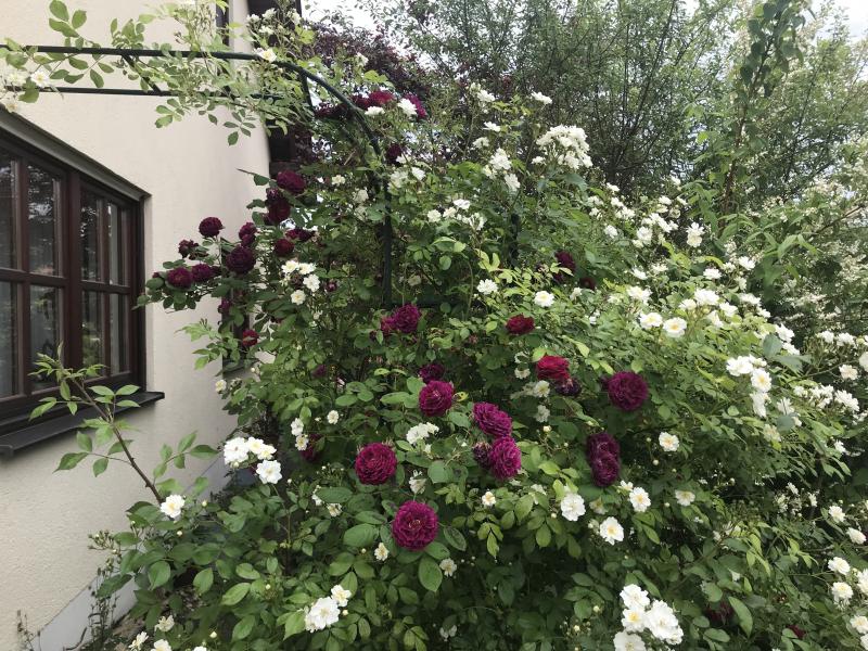 Eine der ersten Rosen, die ich hier gepflanzt habe, war der Zigeunerknabe (gezüchtet 1909). Die Beschreibung von Mercedes passt hier auch: Gesund, robust, winterhart, stachlig. Schönes Farbspiel von Werden zu Vergehen der Blüten.