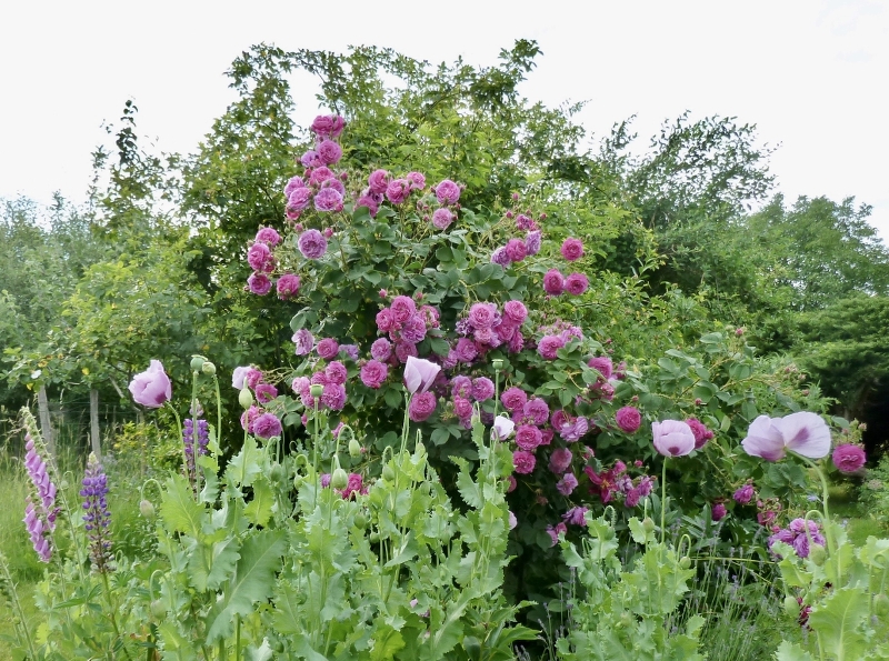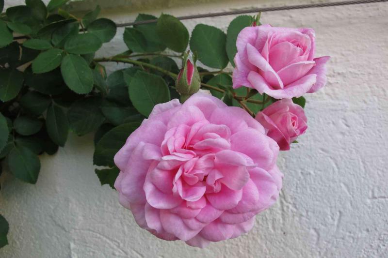 Schönes Thema, Danke, dass Du es eröffnet hast, Lady Gaga! :D . Deine Futtacker Schlingrose ist wundervoll und wie so einige der Geschwindschen Rosen hat sie dieses hinreissende Farbspiel vom zarten Öffnen der Knospe bis zum leicht morbid violettgrauen Vergehen der Blüten. . Genau dieses Farbspiel liebe ich an Mercedes (1886 gezüchtet). Die erste habe ich 2008 an die grundstücksbegrenzende Mauer gepflanzt. Sie ist robust, gesund, winterhart und stachlig. Links von ihr blühen Mme Hardy und Mosel, sind hier aber OT. .