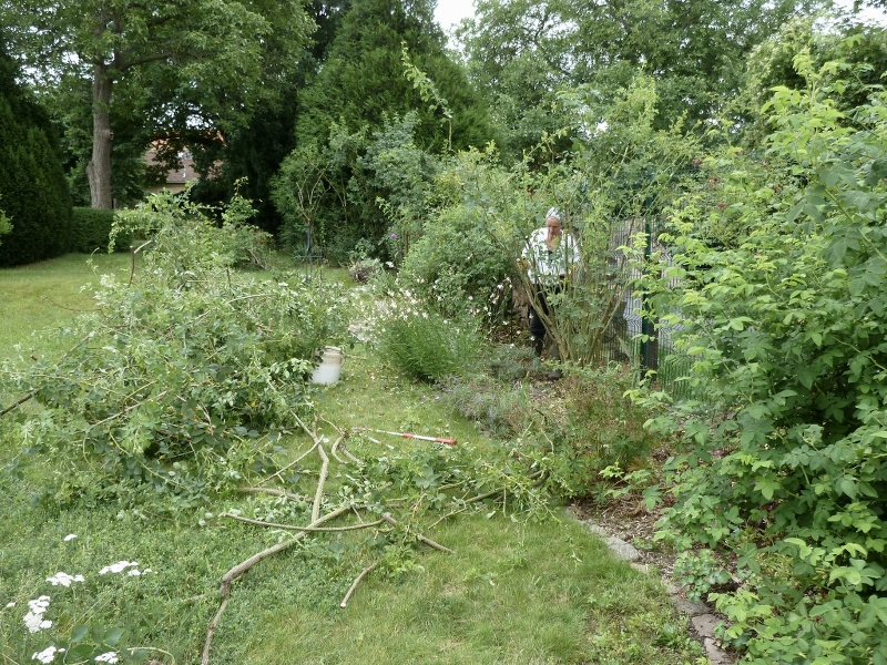 Erinnerung an Brod steht bei mir leider sehr unglücklich, umpflanzen ist nicht mehr, vielleicht schaff ich es im nächsten Jahr, einen Steckling von ihr zu bewurzeln, dann könnte ich es noch mal an einem besseren Platz versuchen. Das tiefdunkle Rot ist bezaubernd (aber weil sie bei mir mickert, gibt es leider kein Bild). . Die einzige Rose von Geschwind, die ich wahrscheinlich nicht wieder pflanzen oder empfehlen würde, ist Ännchen von Tharau. Ein stachelbewertes Riesenmonster, das man wahrscheinlich mögen kann, wenn man ein bisschen masochistisch veranlagt ist. Sie versucht jedesmal, wenn ich ihr zu nahe komme, mich zu skalpieren. >:( . Hier hatte ein Gewittersturm das Monster plattgelegt, da halfen nur noch Säge und Astschere ... . Ich freue mich auf weitere Beschreibungen und Bilder von Geschwind-Rosen von Euch! :)