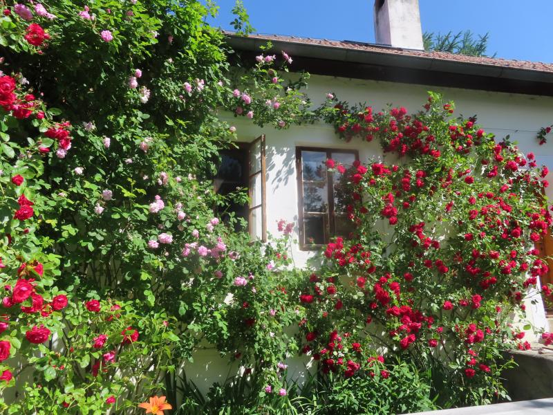 Die Nordlandrose hat es zumindest zu mir geschafft, vermutlich auch ein bißchen Dank ihres Namens ;D Ich hatte sie im Badener Rosarium gesehen, als ca. 2,5 m hohen, gut gezogenen Busch, bei mir sollte sie in der Hausecke stehen (die in anfänglicher Unwissenheit gepflanzte New Dawn hatte dort den zweiten Winter nicht überlebt) und womöglich klettern. Ideal ist es dort nicht, weil für die langen Triebe mehr Platz zur horizontalen Ausbreitung nötig wäre, deshalb strebt sie tw. steil nach oben. Nach ihrem dritten Winter fror sogar sie so stark zurück, daß ich sie auf 50cm schneiden mußte, dann habe ich jahrelang erfolglos versucht, sie irgendwie zu zähmen. Aber ich liebe sie, allein wegen ihres Duftes, der in das dahinter liegende Zimmer strömt, und der schönen Blütenform wegen. Sie blüht früh und kurz, anders als die Flammentanz. Die war schon vorher da, weil es am alten Bauernhaus eine rote Kletterrose sein mußte, also beschloß ich, die Kombination gut zu finden 8)