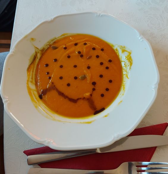 Bei uns gab es Kürbissuppe. Ein Gast verzierte die mit Kürbisöl zur Gepardensuppe. Dabei kam das Gespräch auch auf die berühmte Gepardenforelle.
