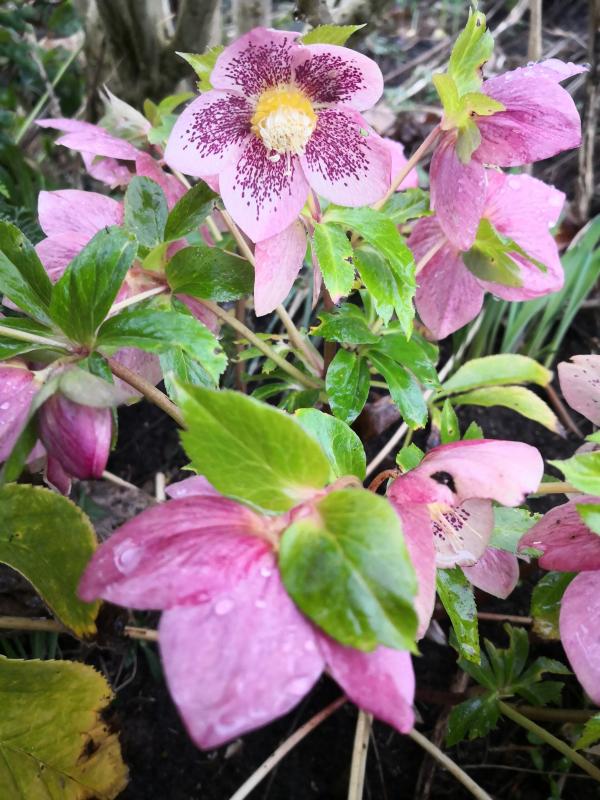 Leider ist dieses Jahr sehr feucht und viele Helleborenblätter dementsprechend lädiert, aber man kann die albinoartig hellen Blattstängel mit rotem Hauch gut erkennen