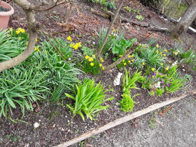 In den Beeten sehe ich auch schon überall den Austrieb der Taglilien. Ihr frisches Laub hellt das Gesamtbild deutlich auf.