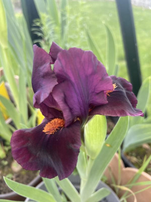 Einige der im letzten Jahr getopften Iris standen wegen der Schneckeninvasion im Gewächshaus, Oddbod erfreut mit der 1. Blüte