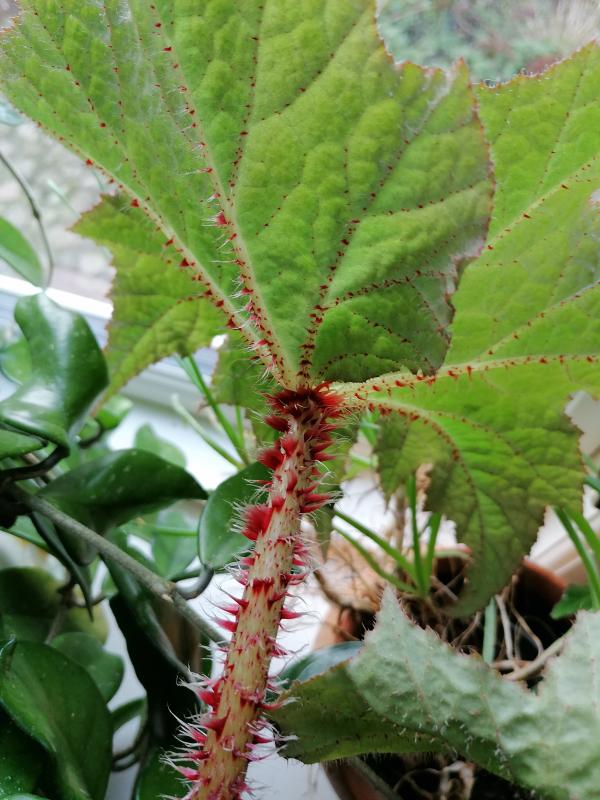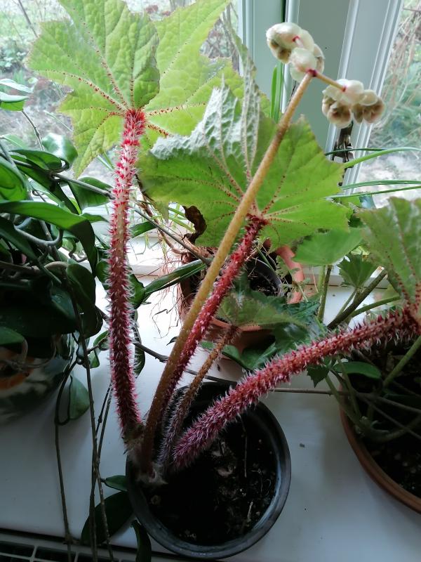 Von der eher selten zu bekommenden Rhizombegonie 'Cachuma' kann ich eine Pflanze abgeben. Die Fotos sind ein paar Wochen alt, sie ist noch gewachsen. :) Gut gepflegt und im Sommer draußen stehend können die Blütenstände 60 bis 80 cm hoch werden. Die Blätter werden größer als Handteller.