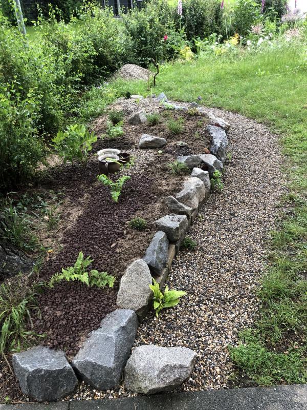 Vor zwei Stunden hat Regen etwas nachgelassen und ich habe gedacht, dass heute einfach perfekte Wetter zum einpflanzen ist. Nach zwei Stunden bin ich völlig durchnässt nach Hause gegangen. Bin noch nicht fertig. Das Beet muss noch gemulcht werden.