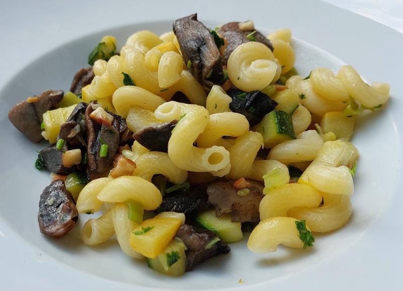 Pasta mit Rotkappen, Birkenpilzen, Zucchini und Halloumi