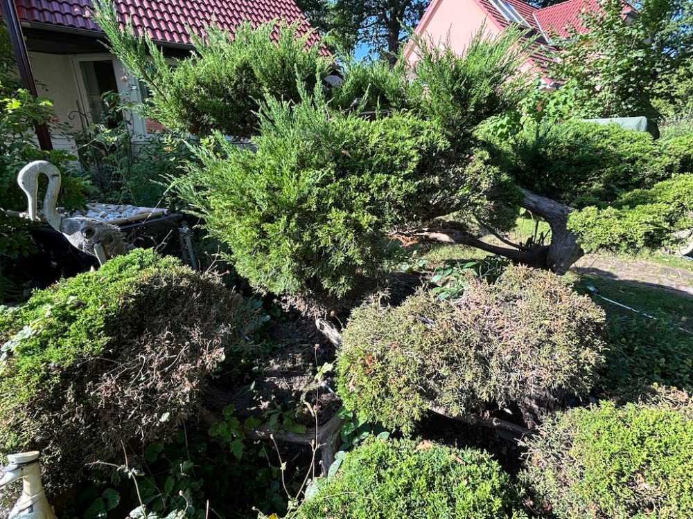 Dieser ist sehr gut angewachsen. Vor etwa 10 Jahren habe ich versucht ihn „japanisch“ zu beschneiden. Seitdem wächst er extrem unregelmäßig. Ca. 50% ist braun und mickrig, an anderen Stellen schlägt er aber richtig aus.