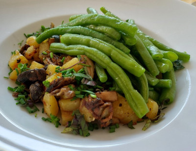 Rohe Kartoffeln mit Pilzen (Rotkappe, Champignons, Parasol) und Zwiebeln gebraten, Gartenbohnen mit Olivenöl, grüner Salat