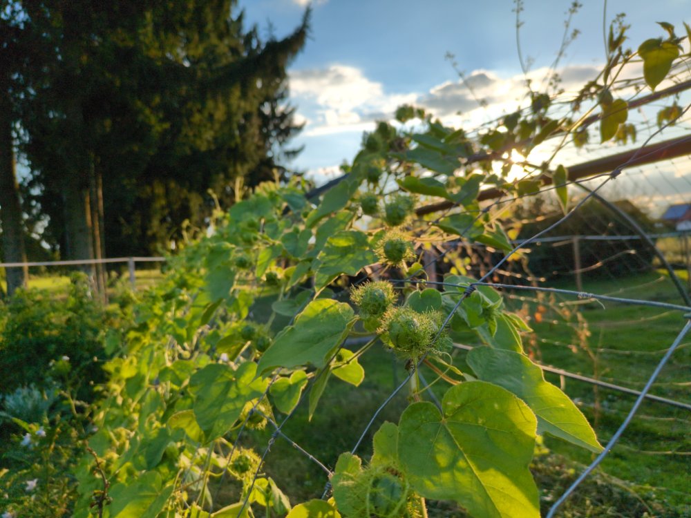 Jetzt Anfang September hat die Pflanze schon fast das komplette Gerüst erklommen. Die Ranken werden immer zahlreicher. Die grünen Kügelchen färben nun rasch um in gelbe Früchte, die ihre Hüllblätter verlieren und abfallen.